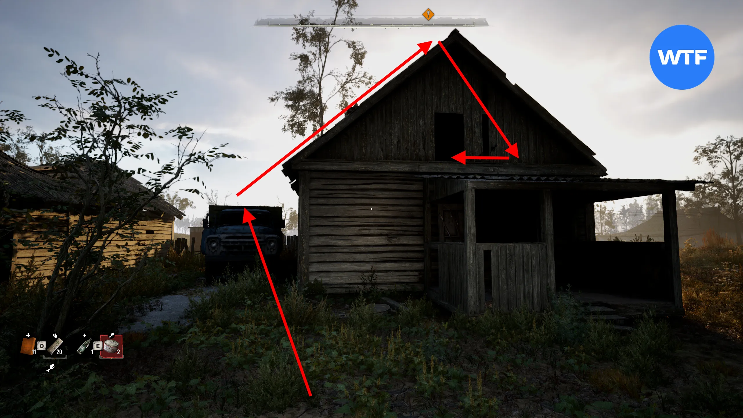 Первый тайник журналиста в Малой зоне можно найти к северу от Залесья. Он находится на чердаке небольшого деревянного дома. Чтобы туда попасть, для начала нужно запрыгнуть на бампер синего грузовика.