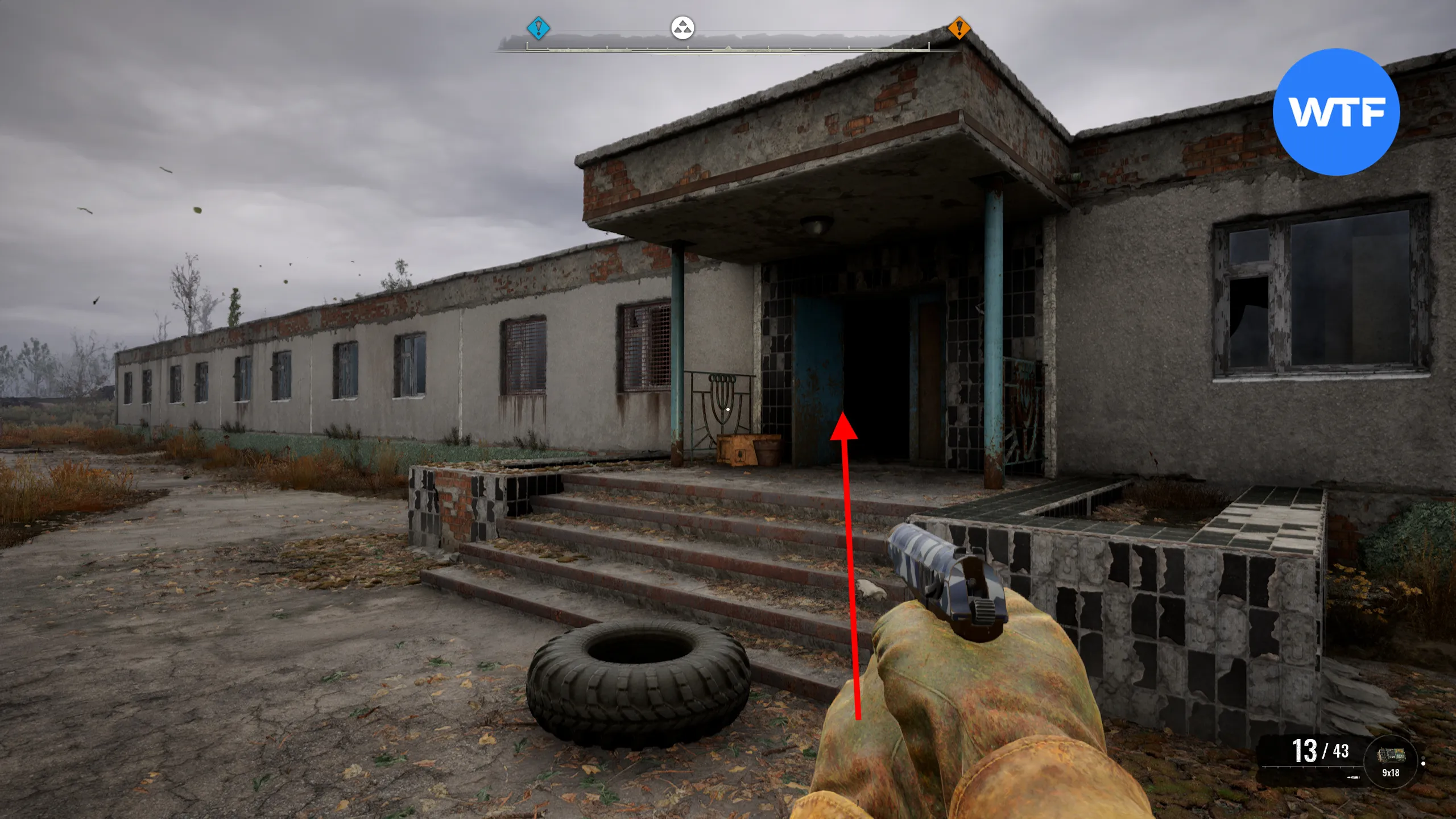 Чтобы найти третий тайник, отправляйтесь к КПП «Север», соединяющему Малую зону с регионом Свалка к северу от неё. Пройдите через белое двухэтажное здание насквозь и после выхода сразу же поверните налево.