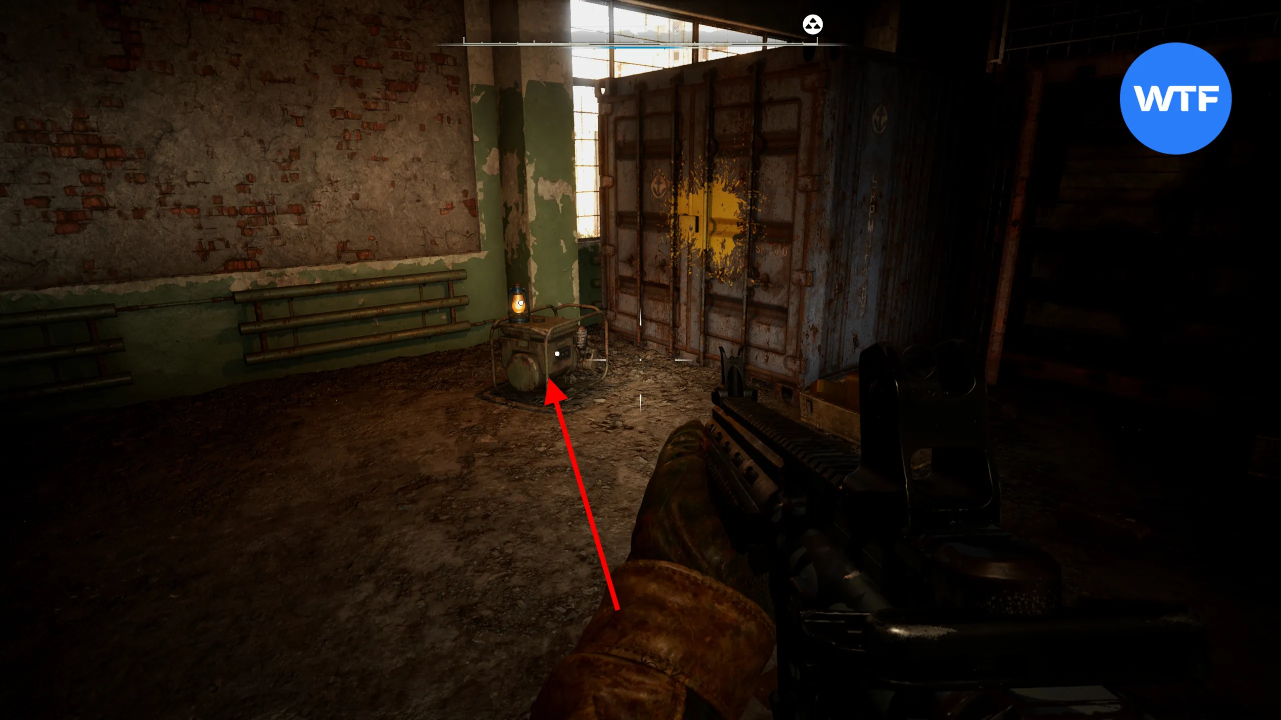 Когда вам все-таки удастся с ним разобраться, запустите генератор в дальнем левом углу склада. После этого поднимитесь по лестнице в ближнем левом углу и нажмите на красную кнопку.