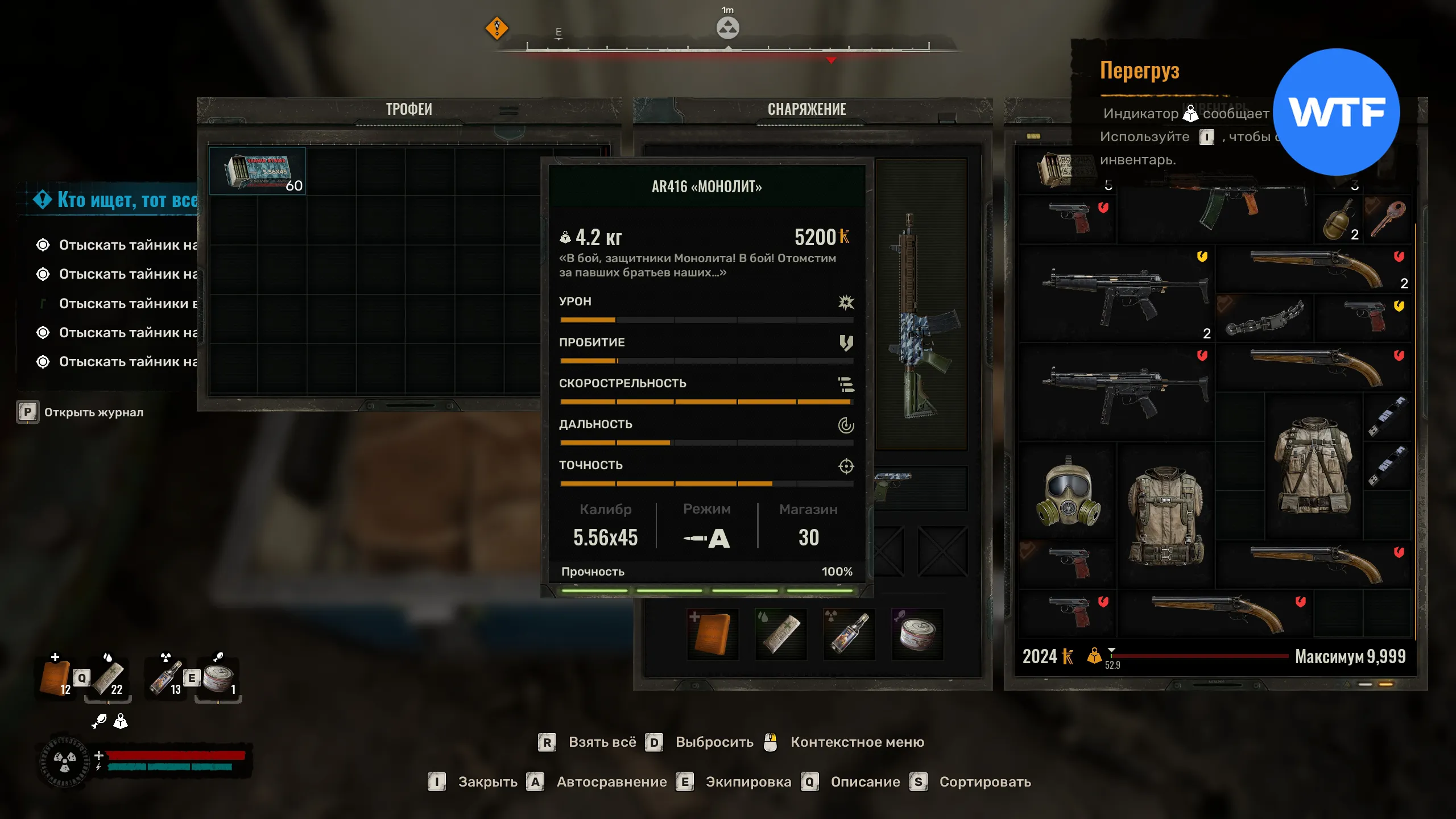 Внутри тайника вы найдете штурмовую винтовку AR416«Монолит» и 60 патронов для винтовки 5.56*45 мм.